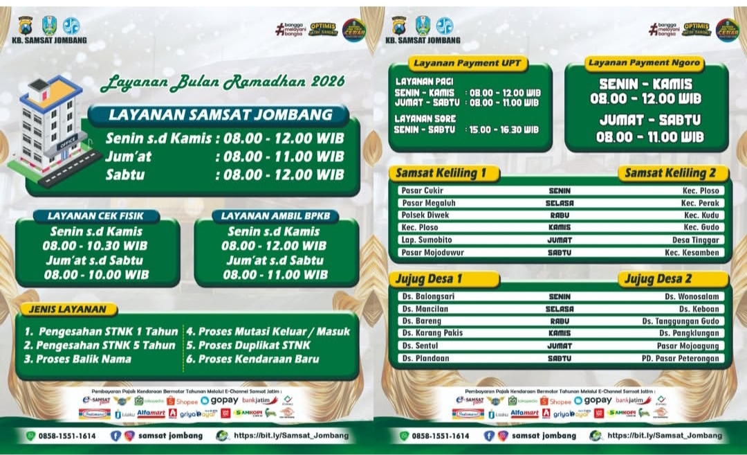 Catatan: Perubahan jadwal ini berlaku efektif selama bulan Ramadan hingga cuti bersama Idul Fitri dimulai. Masyarakat diimbau untuk memantau papan pengumuman di lokasi atau media sosial resmi Samsat Jombang untuk update mendadak.